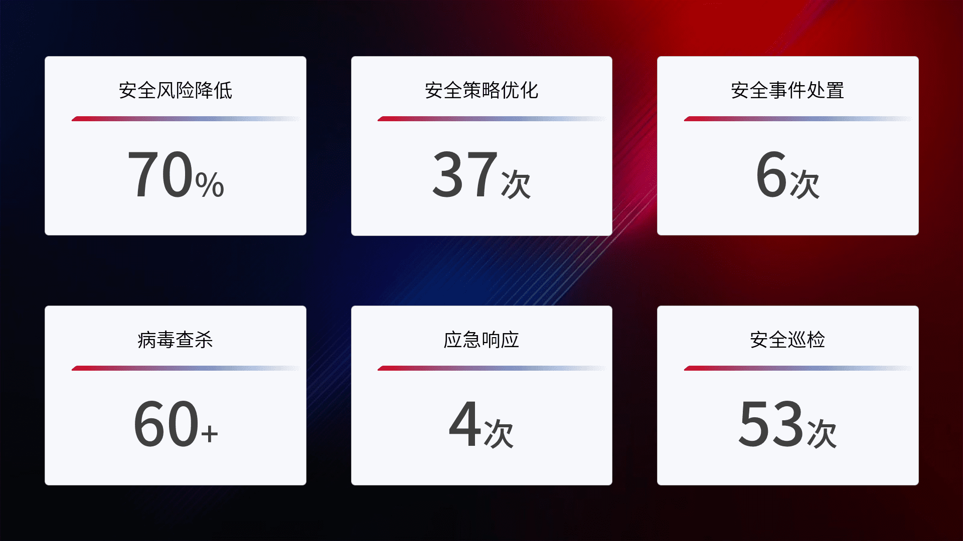提供全面的安全事件报告体系,,,,包括处置报告、、、周报、、、、季度和年度总结,,结合持续监控,,帮助客户深入了解网络安全状况。。。。