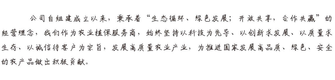 以国家产业政策为导向,,,,尊龙时凯肥业公司加大投资力度,,开拓新市场,,,,成立了控股子公司河北尊龙时凯生态科技有限公司。。。业务涉及开发及兼并畜禽粪污资源化利用项目,,功能性肥料的研发与销售,,,,公司为广大农户、、、农业基地提供病虫害防治、、、农膜回收、、农业技术开发、、、、农业技术服务、、、、技术咨询、、、、基于物联网和大数据的智慧农业建设等一揽子解决方案。。。。以省会石家庄为中心,,,面向华北,,发展特色农业种植和高质量农业产业,,,,打造新生态循环,,,,立志成为农业植保综合解决方案的一流企业,,为推进国家发展高品质、、、绿色、、安全的农产品做出积极贡献。。。