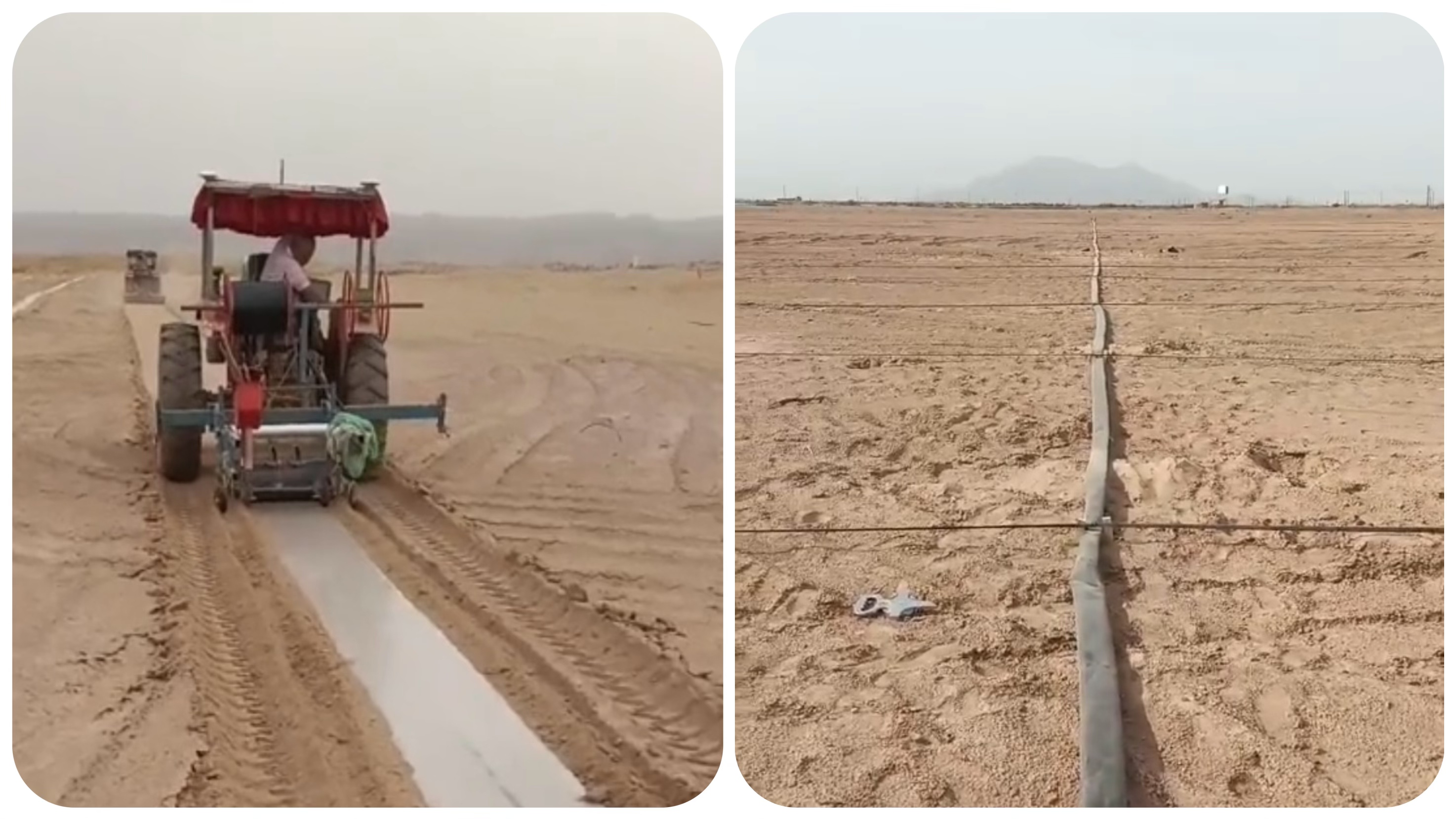 在项目现场,,多台大型机械忙碌地在沙漠中来回穿梭,,进行土地平整、、、铺设地膜与滴灌管道作业,,,现场机器轰鸣,,,,呈现出一派热火朝天的景象。。。